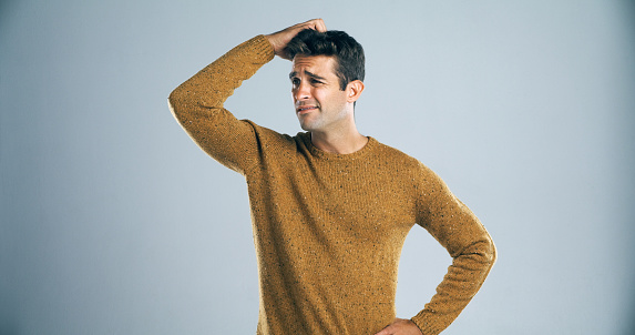 Studio shot of a handsome young man scratching his head in confusion against a gray background